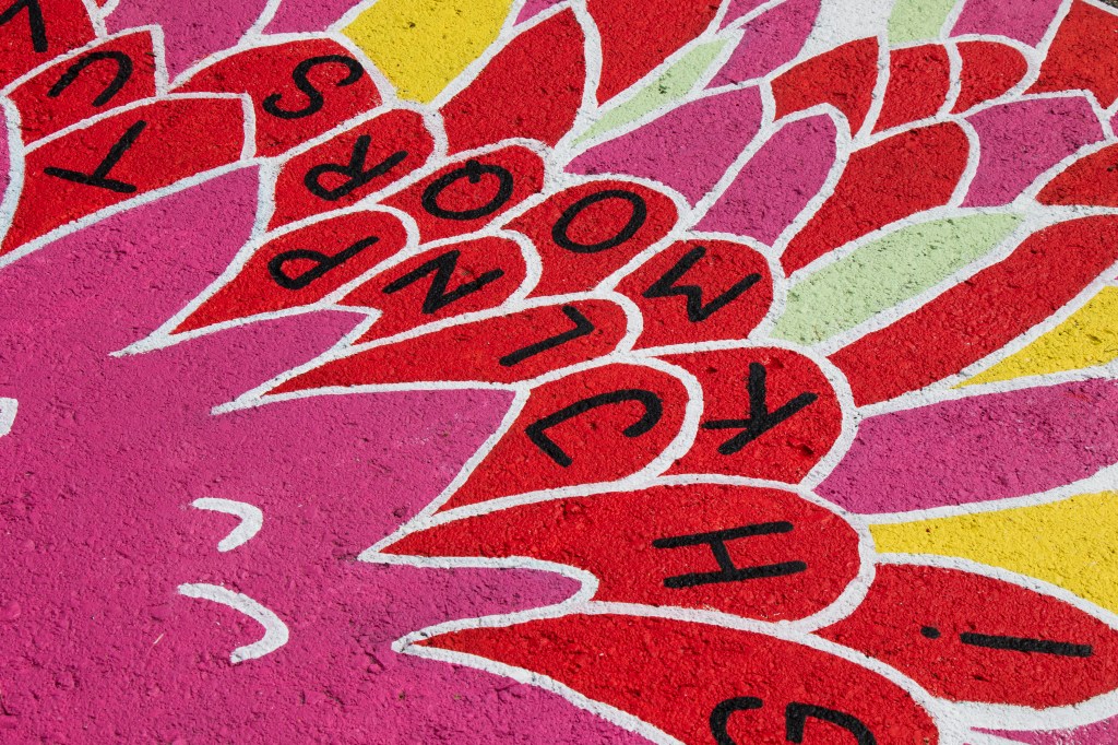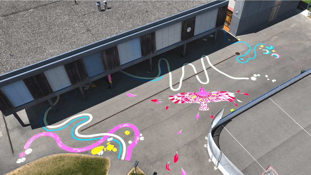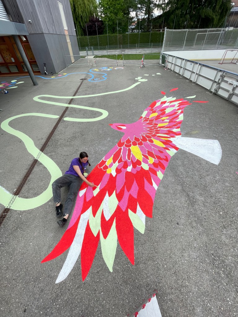 Réalisée à huit mains avec mes chères collègues du collectif Maison Noctua, Michèle Reymond, Marilou Briner et Lucie Fiore, cette fresque a été mon projet le plus conséquent en 2025 ; 300 mètres carrés de préau à habiller de couleurs, 250 élèves de cinq à douze ans participent à la mise en couleurs, un projet de plus de trois mois. La fresque représente les différents animaux totems de l’école; le loup, le castor, la fourmis et l’aigle, tous véhiculant des valeurs mettant en avant le vivre ensemble.